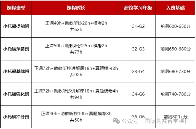 包括:小托福基础班、强化班、冲刺班、直通车等多种课程,助力学生全面提升英语能力,达到三公学校的英语要求。