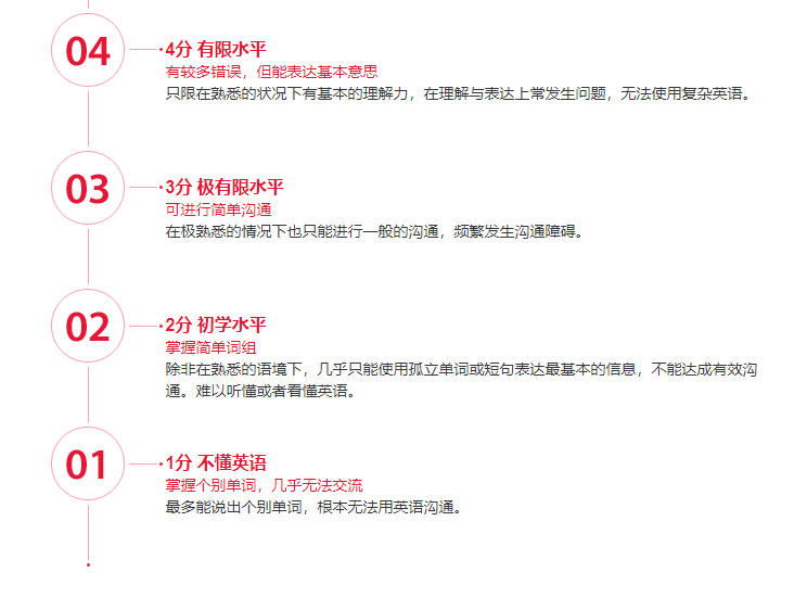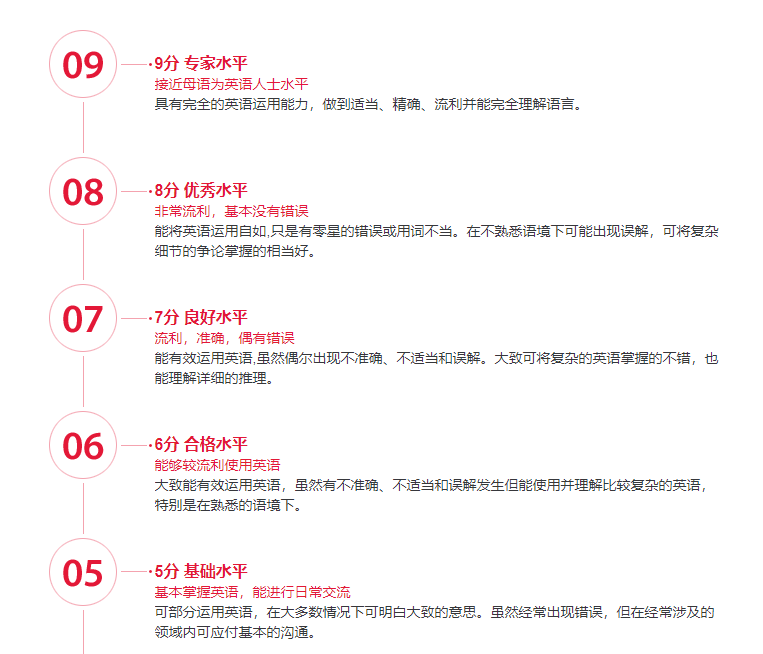 雅思采用9分制评分系统,官方发布了每个等级对应的水平: