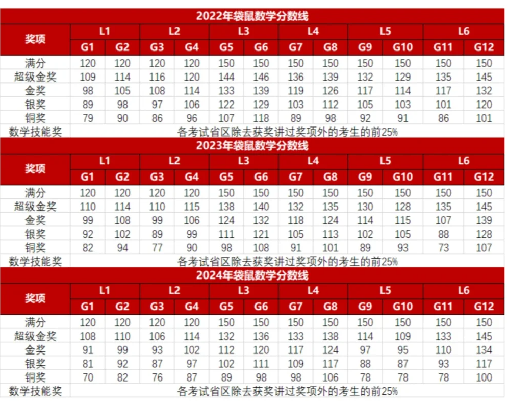 根据近几年分数线变化以及袋鼠A-C级的记分规则,想要获金奖,理想情况下最少正确题数为: