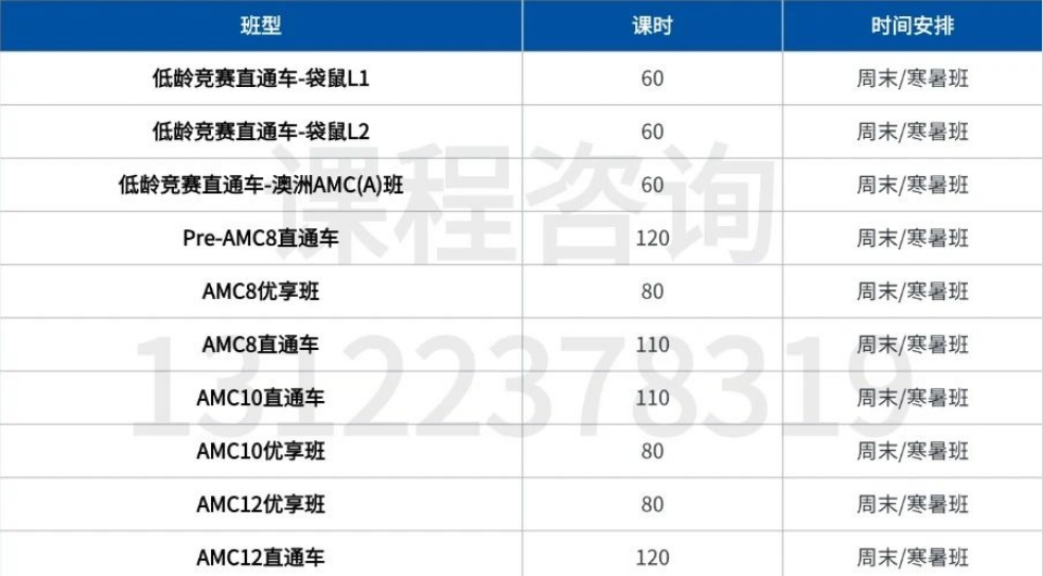 犀牛教育为备战袋鼠数学竞赛、AMC8竞赛、澳洲AMC的学生开设了培训班(基础/强化/冲刺班等多种班型),以针对不同年龄段和学习阶段的重点内容为基石,系统学习国际数学竞赛知识,帮助学生在竞赛中获奖。以下为部分班型: