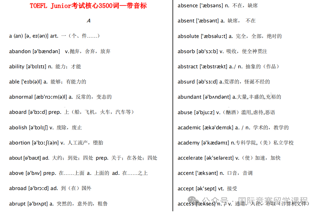 备考小托福,打好词汇基础非常重要,至少需要有3500+的词汇积累,今天分享的是小托福核心3500词(带音标)132页超全汇总