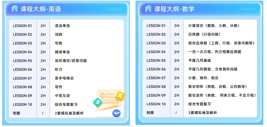 犀牛教育针对想要在上海小升初分班考取得优异成绩的学生,推出了“小升初分班考10次课集训营”,涵盖了语文、数学、英语三科,6-12人小班教学,确保教学质量,配套完整讲义与课后答疑服务。