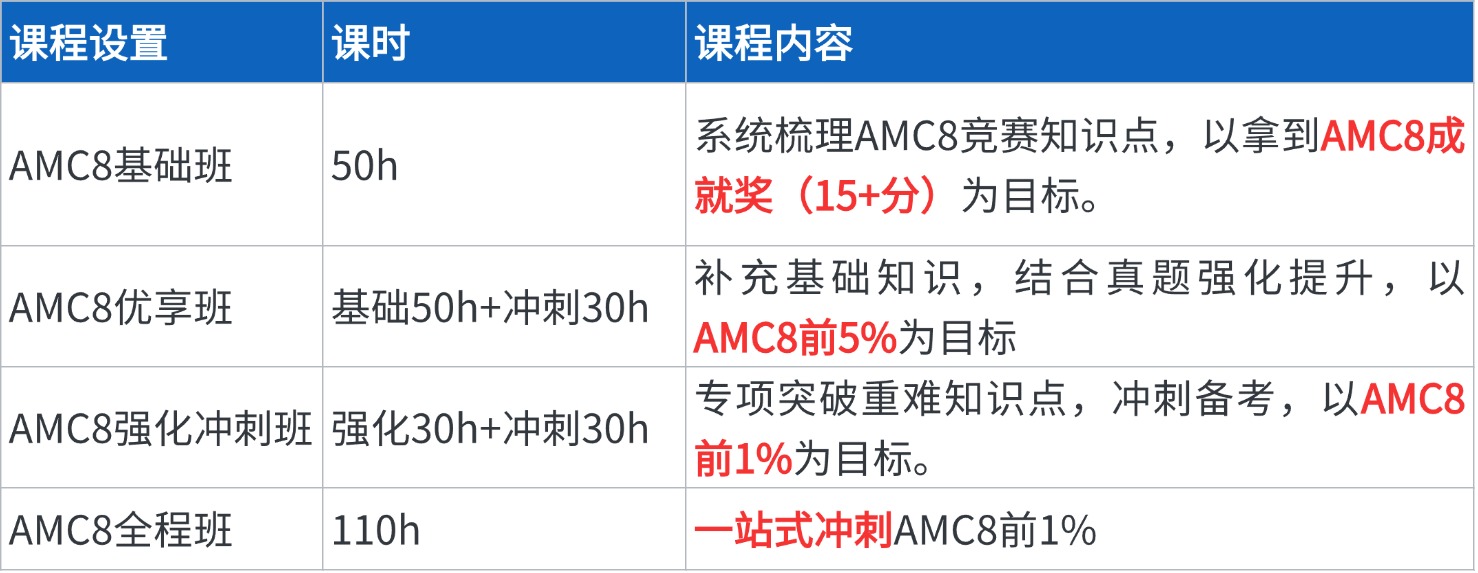AMC8直通车(110h)针对不同基础学生,进行基础补充、强化训练和冲刺备考。